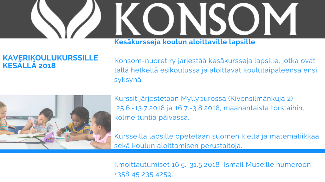 Kesäkursseja koulun aloittaville lapsille Konsom-nuoret ry järjestää kesäkursseja lapsille, jotka ovat tällä hetkellä esikoulussa ja aloittavat koulutaipaleensa ensi syksynä.