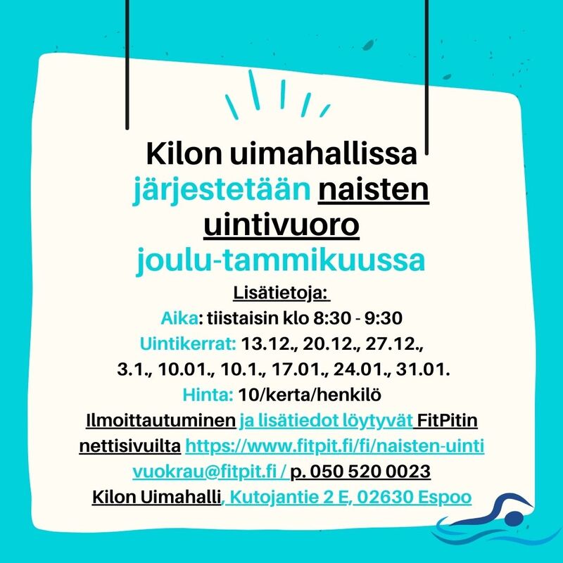 Kilon uimahallissa järjestetään tiistaisin naisten uintivuoro kello 8:30 - 9:30. Vuoron hinta on 10€/kerta/hlö. Uintikerrat: 13.12. , 20.12., 27.12., 3.1., 10.01., 10.1., 17.01., 24.01., 31.01. Vuoron aikana koko uimahalli on varattu vain naisten käyttöön. Paikalla on naispuolinen uinninvalvoja, jolta voi pyytää vinkkejä ja apua uinnin harjoitteluun. Hallillta löytyy erilaisia uinnin apuvälineitä käytettäväksi. Palvelun suosiota kokeillaan joulu-tammikuun aikana, jonka pohjalta palautetta kerätään mahdollisen jatkon suhteen.