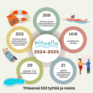 Pinnalla-hankkeessa on takana ennätyksellinen vuosi. Hankekaudella 1.4.2024 - 31.3.2025 hankkeen vesiliikuntatoimintaan on osallistunut yhteensä 533 tyttöä ja naista!